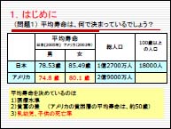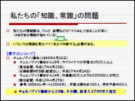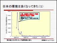 1.『はじめに』 一見、テーマと関係の無いことからスタート。 問題1:(平均寿命世界一の)日本とアメリカ合衆国とでは、どちらが100歳以上の人の割合が大きいか。正解:日本は総人口1億2700万人に対して1万8000人、米国は総人口2億9000万人に対して6万5000人で、米国の方が大きい。 問題2:近年、日本の少年の凶悪犯罪は増加しているか。正解:少年の凶悪犯罪は昭和30〜40年がピークなので増加しているとはいえない。統計上、最近の少年強盗は増加しているが統計の取り方の変更による影響が大きく、実態としてピーク時の件数には全然及ばない。 先生はこれを通じて「マスコミの情報は必ずしも真実の姿を映し出していない」、「イメージと事実は大きく異なる」ということを強調されました。環境とエネルギーを考えるうえでイメージだけで理解すると間違えるので、いろいろな情報を比較検討して自分の頭で考えよう、ということです(これは今回の隠れたテーマでもありました)。