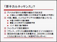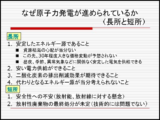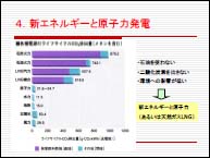 4.『新エネルギーと原子力』 新エネルギーとしては風力発電や太陽光発電が有力です。新エネルギーの利用ではヨーロッパが進んでいると報道されますが、ドイツは意外に石炭火力発電の依存度が高く、原子力依存度も日本と同じようなものです。確かに新エネルギーの割合は多いのですが、現状でも5%ぐらいで、これからは頭打ちになるでしょう。なぜならこれらは風まかせ、お天気まかせで供給が安定しない欠点があるからです。 デンマークの風力発電の割合は20%で、今後はあまり伸びないと思われます。供給の不安定さは全欧から埋め合わせをして賄っています。1980年に原発廃止を決めたスウェーデンも他の代替エネルギーがないことから原子力を継続して使っていますし、新設も再検討しています。日本でも新エネルギーの割合は2030年で10%が限度でしょう。 これに対して原子力は再評価されつつあります。フィンランドでも建設中だしアメリカが30基以上の増設を決定、中国、韓国、インドでも建設しています。二酸化炭素を出さず、安定した供給が可能であることが評価されているのでしょう。