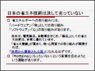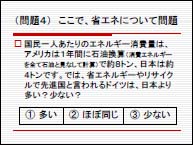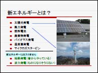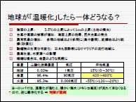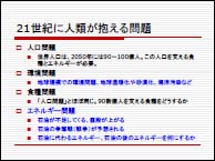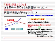 3.『エネルギー問題』 二酸化炭素の排出は化石燃料の消費によって生じます。では化石燃料はあと何年持つと考えられるのでしょう。過去にいろいろ計算されましたが、良質で採掘しやすい油田には限りがあるのでたとえ油田が発見されても価格上昇や石油獲得競争(戦争を含む)は不可避です。 そこで、二酸化炭素削減の観点からも、エネルギー確保の観点からも、石油を使わない社会にすることが大切です。日本はハードウェアの省エネの技術は優れていますが、生活習慣等ソフトウェアとしての取組みが遅れています。今後は物心両面からの省エネへの取組みが必要です。新エネルギー(自然エネルギー)の利用は勿論、原子力も視野に入れるべきでしょう。