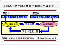 2.『環境問題』 環境問題の中心は「地球温暖化(温室効果)」の問題です。「地球の気温が上昇傾向にある」ことと、「二酸化炭素が増加している」のは事実です。ただしこの原因については「人間が二酸化炭素を排出するから」なのか、「太陽活動・地軸の傾きが変化したから」なのかで争いがあり、ほとんどの研究者は前者の説を支持していますが、不明な点も多く断定はできません。ただ、近年の変化が急激なので放置するわけにも行かず対策を講じることになりました。 温暖化すると農業や水資源確保に影響が出ます。必ずしも台風や高潮が増えるわけではありません。因果関係がハッキリしないのです。ただヨーロッパでは、メキシコ湾流(暖流)が流れて来なくなり寒冷化すると予想されており、EUが対策を急ぐ理由がここにあるのです。 二酸化炭素を削減するので世界が協力しようとした取組みに京都議定書(COP3)があります。ところがこの条約は基準とする年(90年)と締約年(97年)の経済状況の変化を考慮しなかったため、締約国間で不公平が生じています(これがアメリカの離脱した理由です)。 日本も今のままでは目標が達成できないのでロシアから二酸化炭素排出権を購入することになるでしょう(日本の目標は90年に比べ6%減。締結した97年を基準にすると15%減でさらに厳しい。ロシアは90年に対して現状維持が目標であったが、その後経済危機に陥り97年を基準にすると40%の増加も可能)。 税金をロシアに支払うより、努力して二酸化炭素削減をしたいのは山々ですが、現実は宅配便が普及し競争が激化した運輸業や、パソコンやエアコンの普及が浸透したオフィスや家庭で思うように省エネが進んでいません。