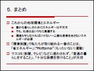 5.『まとめ』 脱石油の観点からも、二酸化炭素削減の観点からも省エネと炭酸ガスを出さないエネルギーの利用を推進すること。マスコミに惑わされず普通の暮らしをすることが大切です。