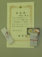 野口先生の呼び出しで、升谷会長からの賞状と記念品の授与式。