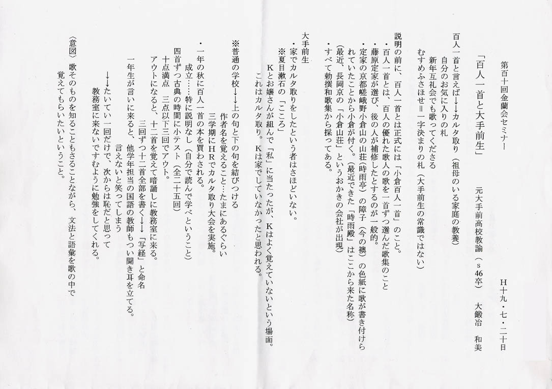 さすが大手前の先生で、ぴったり50分の授業でした。久しぶりにみやびな王朝文化の一端に触れ、頭の中を耕すことができました。 このリポートを作るにあたって、WEB上でいくつか検索した中に、大鍛冶先生の百人一首の模様の包み紙のおかき屋さん?のHPに至り、その中に面白いページを見つけたので、ご存知の方もいらっしゃるとは思いますがご参考までに解説と共に記しておきます。