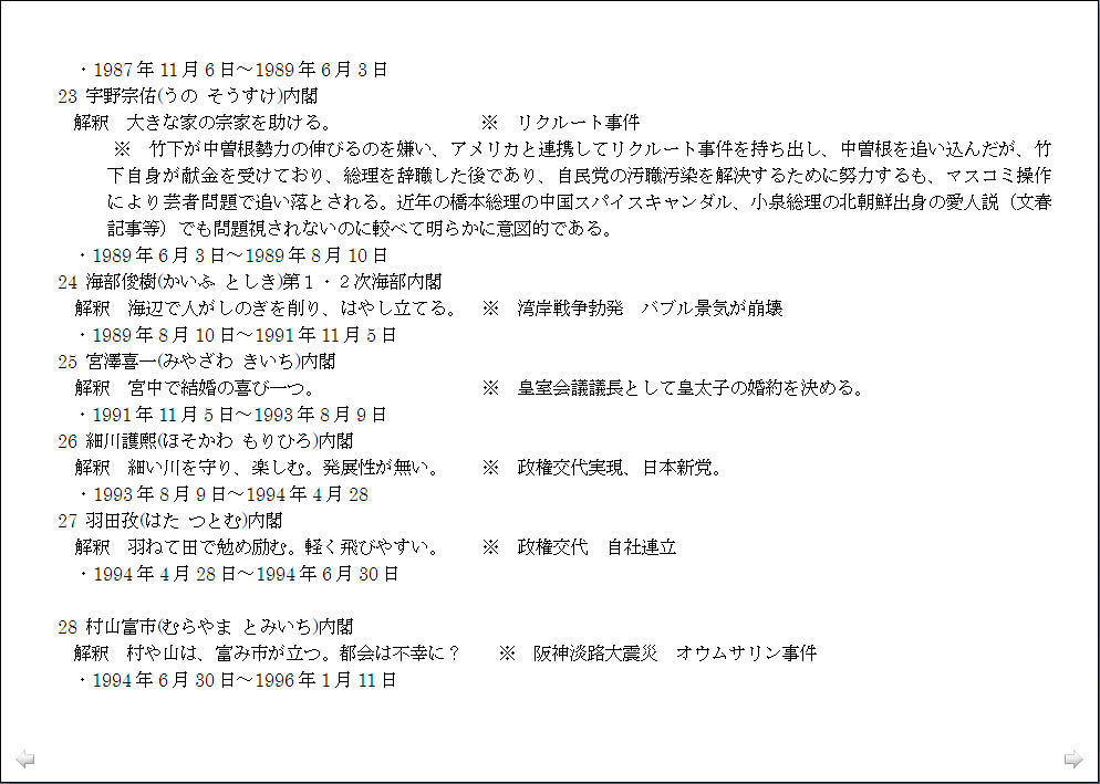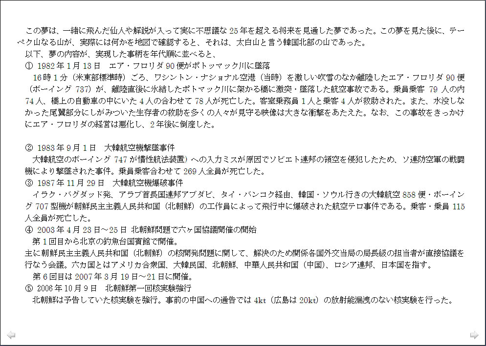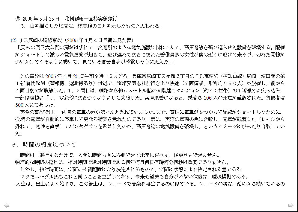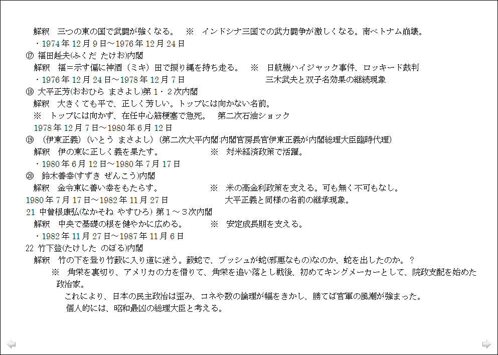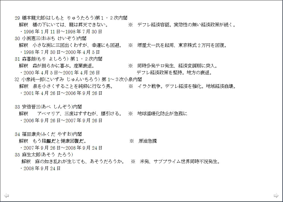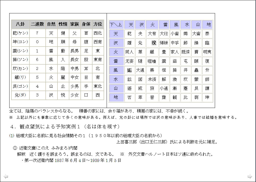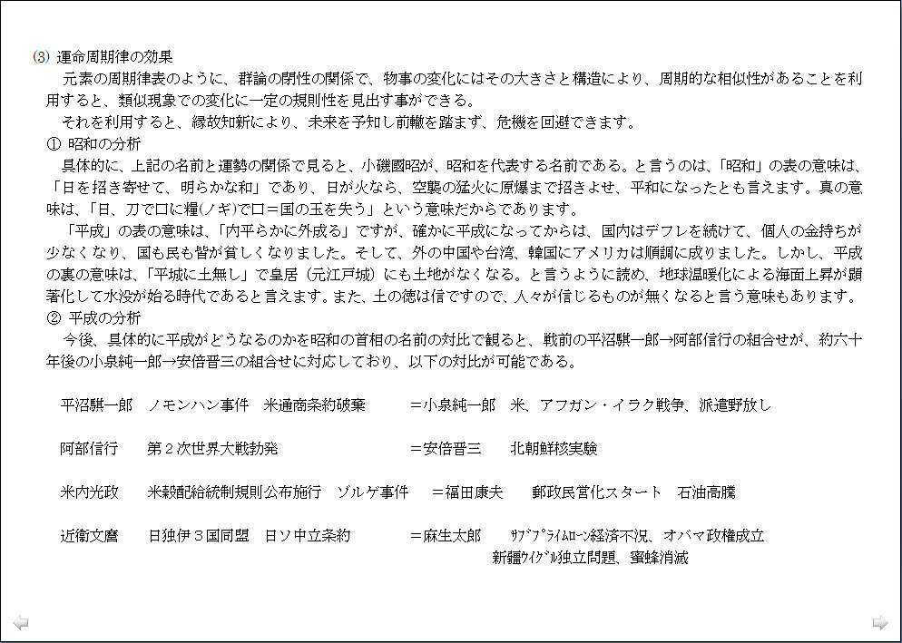 総理大臣の名前に見る社会情勢の分析は興味深く、「名は体を表す」ことを実感したのですが、「この世界の変化のパターンは規則的にならざるを得ない」ということから面白がってばかりもいられず、平成がどうなるかを昭和の首相の名前の対比で観ると、今後日本の混乱はまだ2011年迄続き、2012年からは、それが世界の混乱に移行すると読める、と言われたのでは、少々先行きが心配です。ただ、未来を決定するものは人間の意志であり、温故知新により前轍を踏まず危機を回避できるとなれば、自我や我欲を通すのではなく、利他的に動こうという気になります。 |