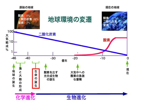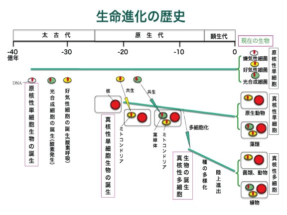 46億年前に地球が誕生し、37億年前に生命が誕生し、原核細胞から真核細胞に、