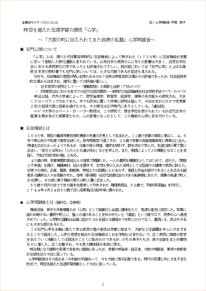 江戸中期の1729(享保14年)に京都市内で心学の講座を始めました。講科は無料、