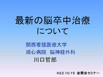 ここのところ、仕事にかまけて金蘭会セミナーに参加できていなかったのですが、今回は、 パソコンを駆使して、先生が実際に手がけられた手術場面の映像を見ながらの解説はかなり 後述談ですが、先生は当初、脳卒中の予防のお話を考えておられたようですが、予防に |