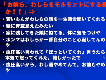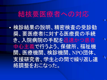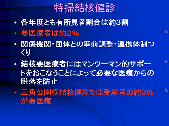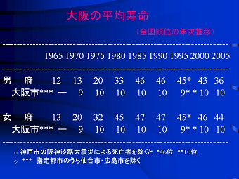 公衆衛生学、社会保健学を専門分野にする逢坂隆子さんが、大阪府の平均寿命が全国の 色々な問題を抱えている釜ケ崎の人達に結核検診を受けてもらい、患者を見つけだし入院 講演後お弁当を食べていると、同級生の一人が、「僕、奥さんに先に逝かれてん。僕が死ん そう云えば私達の在校中にも、結核の治療の為休学したり留年したり、体育系のクラブ活動 東日本大震災の2週間後でもあり、その悲惨な爪痕や福島原発事故の放射線問題などに |