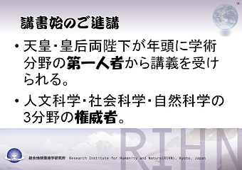 「講書始で語る −海洋アジア文明交流圏」を拝聴して まず講書始が明治2年に始まる古い宮中行事で、今日の様に3分野の講義と