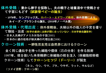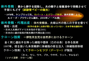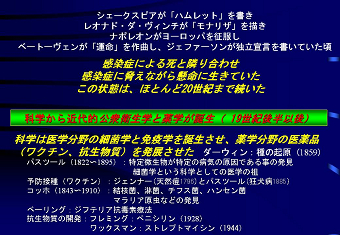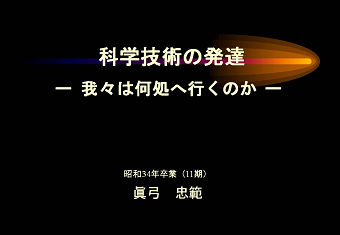 同期生であり日頃から親しくしている真弓君の講演を聴くのは初めてであったが、 講演内容は、100年ほど前から急速に発達し人類に貢献してきた医療科学の 私が興味を持ったのは、例えば「モナリザ」「ハムレット」「運命」などの芸術遺産の この「高齢」が死に結びつく「内なる敵」の説明として遺伝子と生殖医療を挙げ 講演の纏めとして、とりわけ医療分野における最先端技術は直ぐにビジネスチャンス 医療に限らず、原発はもちろん自動車、ITなど科学技術の功罪を見直す時が来て