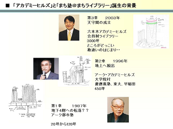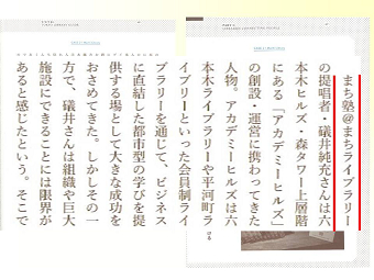 「六本木アカデミーヒルズ」にて会員制ライブラリー事業を考案し、カンファレンス、スクール事業を併設する文化施設「六本木アカデミーヒルズ」事業を総合事務局長として推進。 |