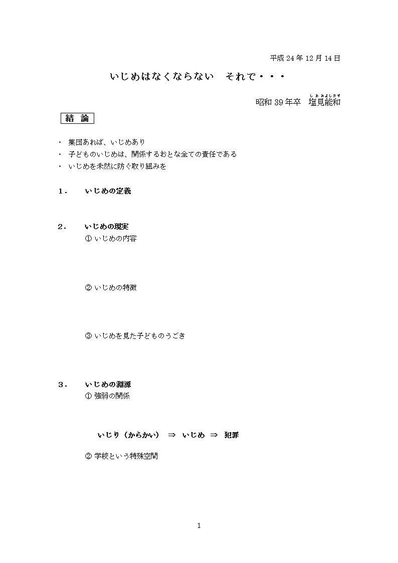 教師として塩見氏が事に対し真摯に対応してきた経験を踏まえ、いじめ撲滅には、