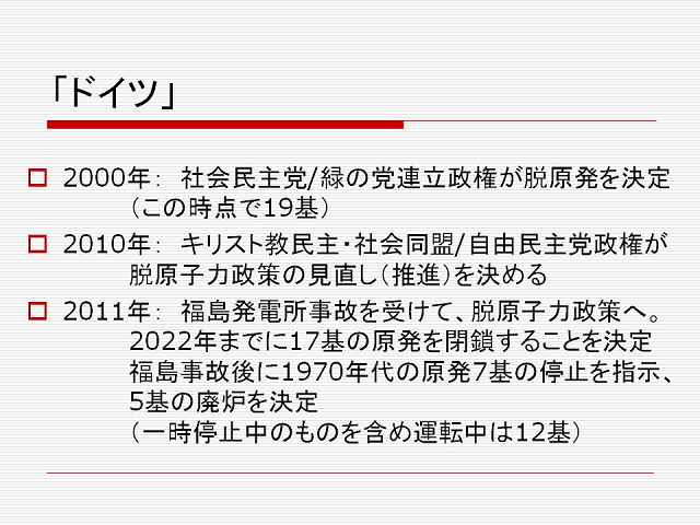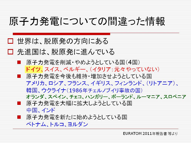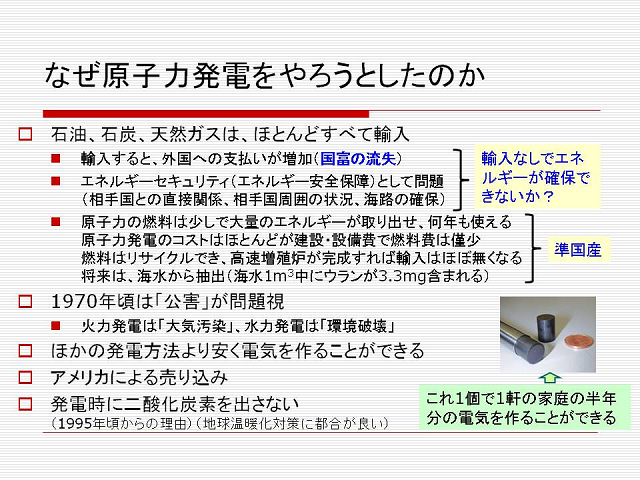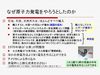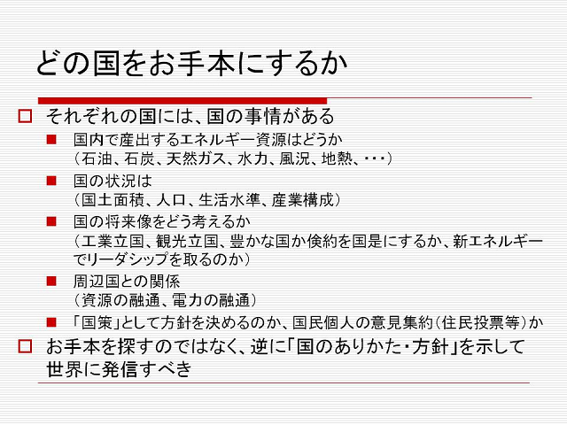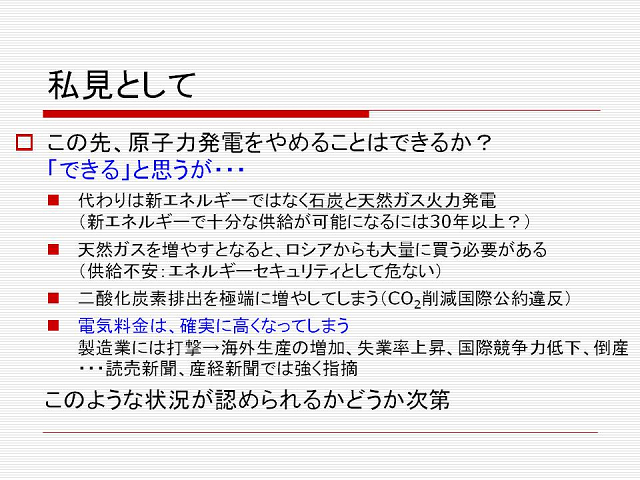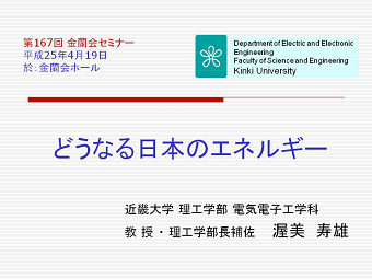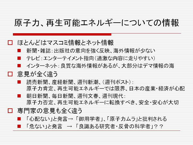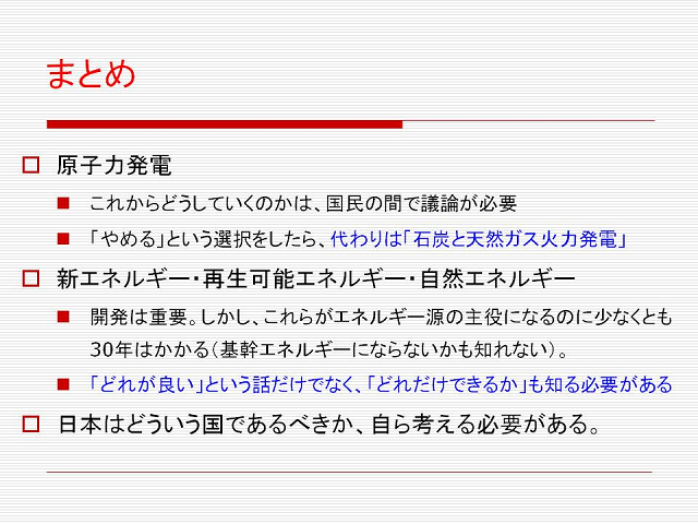 渥美氏が、全国各地にご講演に行かれている事を知り、セミナーでもお話していただく事が できました。 東日本大震災以後、エネルギー問題が取り上げられる事が多くなったものの、 今回あらた めて日本のエネルギー事情、現状把握や未来予想などをきちんと理解するきっかけとなり ました。 国別のデータを一つ見ても、気候や人口なども加味して比較してこそ正しい 判断ができることを学びました。 今後もマスメディアで色々な意見が取り上げられる事と思いますが、感情論ではなく、 事実にもとづく公平な判断がなされることを願うばかりです。