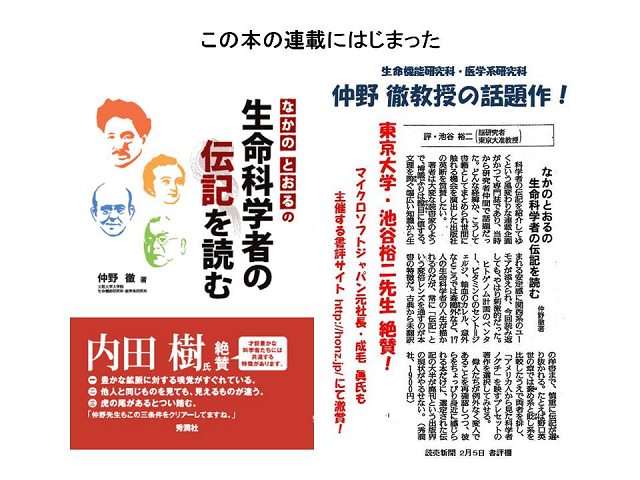 仲野先生による演題「生命科学者の伝記に学ぶ」を拝聴して