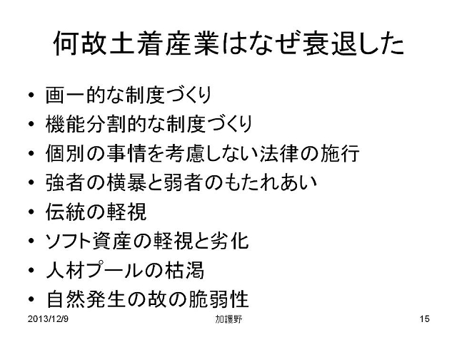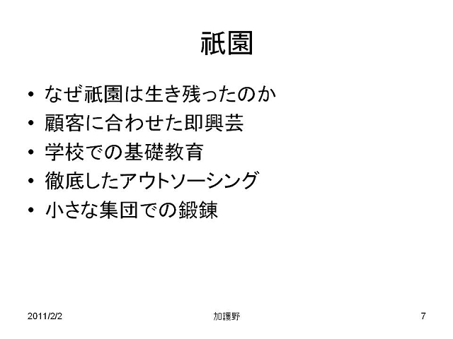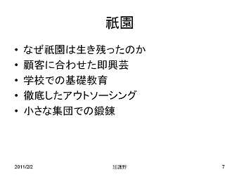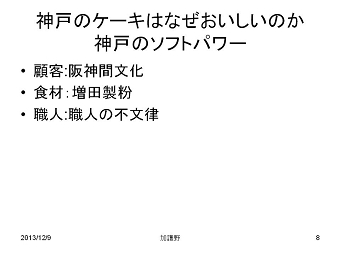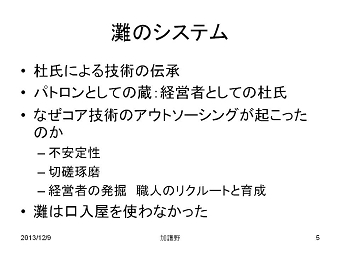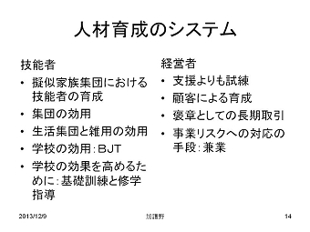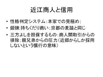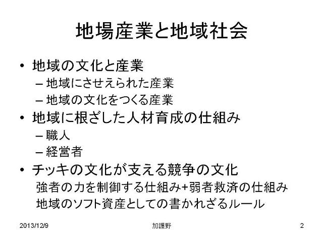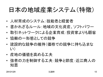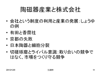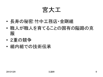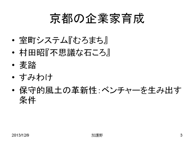 加護野先生のお話は、現在、多くの企業が当たり前と思っている法律や働き方、 事業の承継などにおいて、日本独自の成立ちを形成していた江戸時代の事例を基に、 現在の正社員を前提とした働き方以外の方法や、町の人や働いている人やお客様 が監査の役目を果たしていた事例など、普段、今のルールの中でしか考えることの 無かったポイントを分かりやすく講演いただきました。 残念ながら時間が限られていましたので、じっくり伺えなかったこともあったのでは と感じました。