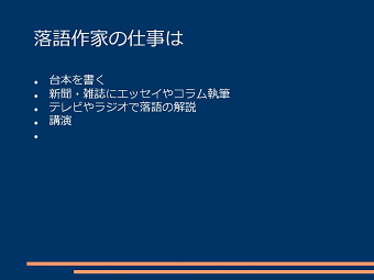 そのうちの一人だという。落語作家の仕事は、新作落語の台本を書くことだが、その他に、