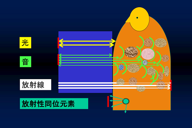 光(内視鏡)・超音波(エコー)・磁気(MRI)・X線(CT)・アイソトープ・ポジトロン(PET)など、さま
