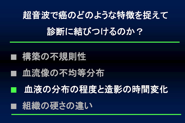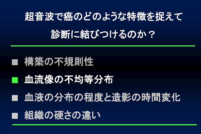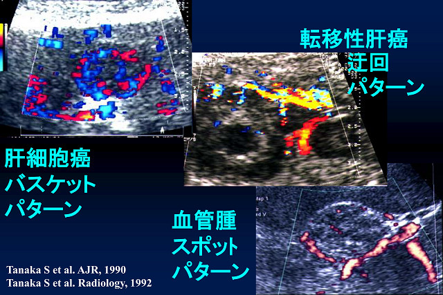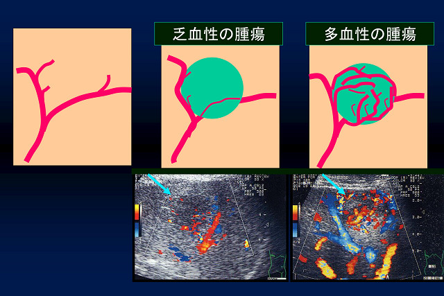 血流の向きと速さをカラー画像で表示することにより、多血性か乏血性かで、腫瘍の種類を