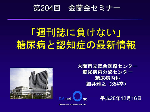 12月16日の金蘭会セミナーは、「週刊誌に負けない糖尿病と認知症の最新情報」の題で、