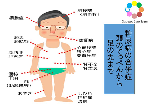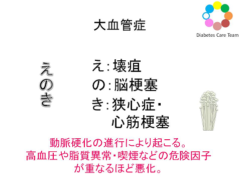 3大合併症は「しめじ」(神経(神経障害)、眼(網膜症)、腎臓(腎症)、大血管症