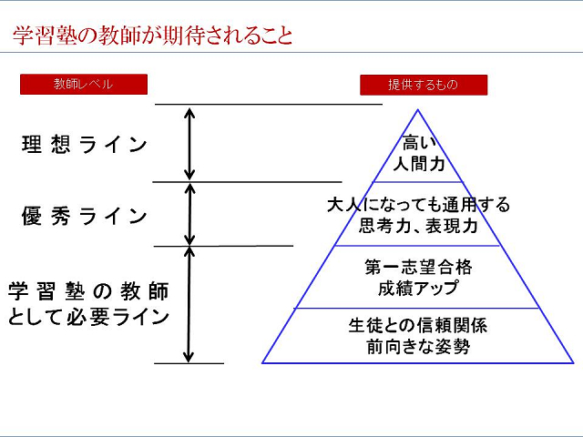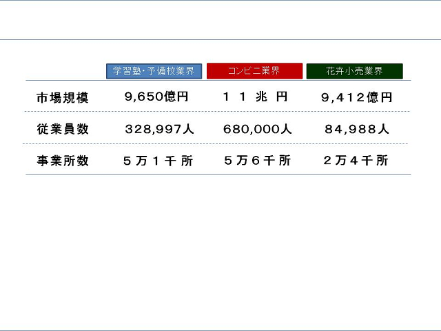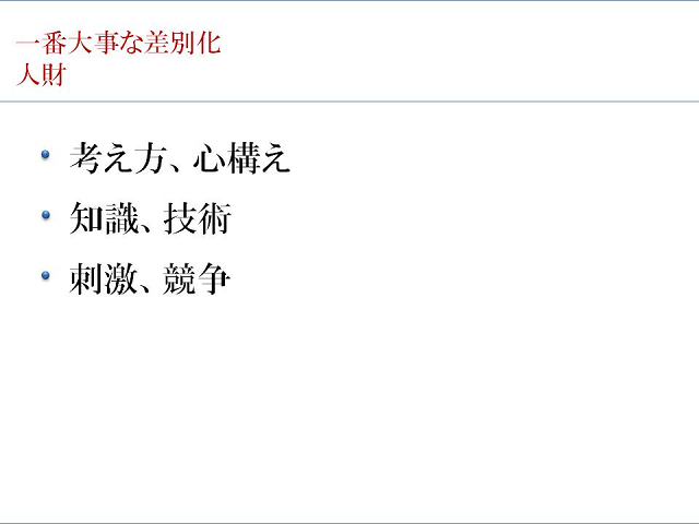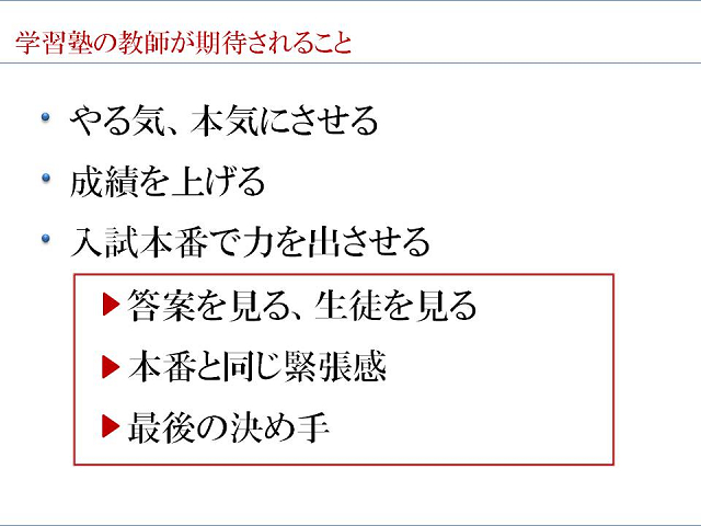 サッカー部に所属しておられ、その先輩からのご紹介で今回ご講演 いただきました。 関西一円で見かける青い看板。少子化の中、年々その教室を多く 見かける様になりました。 高原社長から、その成長のシステム、知恵、きめ細やかな指導者の 人「財」育成のノウハウを伺いました。 学校と塾との違いついて、学校は人間的な成長をも求められるが、 塾に保護者が求めるのは学力向上と志望校合格であり、 保護者=顧客を満足させることが塾の一番の課題だと言われたことが 印象に残りました。 また、指導者が生徒一人一人に合った言葉をかけることで、 集中力、やる気が違ってくるというお話も、塾に限らず、 社会、家庭にも当てはまることだと感じました。
