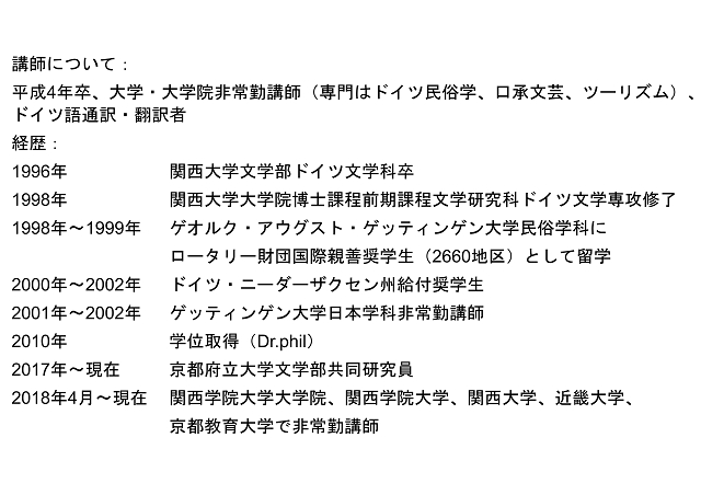 平成4年卒、大学・大学院非常勤講師(専門はドイツ民俗学、口承文芸、ツーリズム)、