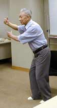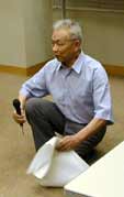 | シテ(主役)の座り方は、右膝を立てる。衣装を着けるときにどちらの膝を立てるかで、着付け方が違う。 | ツレ(準主役)の座り方は左膝をたてる。座ったままの方向転換はとても大変らしい。 | この、少し腰をかがめた歩き方の基本が一番難しいらしい。 | 戦で、首を打ち落とす時の表現が立てていた扇をカクッと寝かすこと。 |