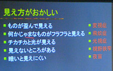 この中で危険なものは変視症と視野狭窄。その他のものはそれほど気にしなくてもいいものが多い。 |