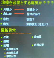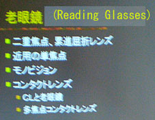 この画像がピンボケで申し訳ないが、「モノビジョン」という言葉を見て欲しい。 片目を近視片目を遠視(老眼)状態にするというもの。これは合う人と、合わない人とがあるらしい。合う人にとってはとても快適らしい。片目にコンタクトを入れるのだ。 多焦点コンタクトとか眼内レンズはまだ試行錯誤の段階。 |
