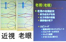 左の二つの図の一番下がどちらも正視。 近視は眼軸長が長く網膜に届く前に焦点が来るから凹レンズのめがねをかける。 老眼はその逆である。 右の図のエピソードで「講演会のスライド」とあったのは、なるほどとうなづけた。 |