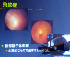 | 眼球内を満たしている硝子体は99%の水分と1%のコラーゲンで出来ている。そのコラーゲンが加齢とともに縮んでくると硝子体の後ろの膜が剥離してくるそれが飛蚊症の原因である。これは白髪になったり皮膚にシワが出来てくるのと同じだと考えるといい。 | 40歳過ぎてまぶしく感じるようになると白内障が考えられる。これも飛蚊症同様老化現象の一つだと考えるしかない。 ライトを見たときまるい傘のようなものが見える虹視症の場合もある。 |
