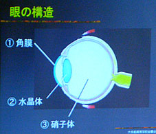 | 眼科に来る患者さんのうち同じ訴えでも意味が違う。見えないといいながら一人で歩いてくる人も。光が分からない人から、メガネをはずしていると見えない人まで。 | 眼球の直径は意外に小さく2.4cm。みんなの予想はそれより大きかった。また赤ん坊の頃の水晶体は外へ出すと球形になる。 目が脳の一部である、という言葉には衝撃を受けた。 |