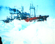 | 砕氷観測船「宗谷」。 1956-62年まで活躍。やがて輸送力に限界があることがわかり、1963-65年にかけて建造された「ふじ」が取って代わる事になる。 |
