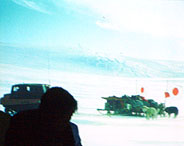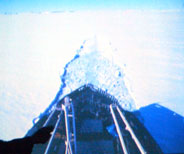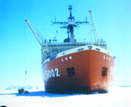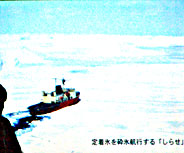 | 当時は犬ぞりを使ったりしたが、現在は外からの動物の持ち込みは一切禁止である。 | 定着氷を砕氷航行する「しらせ」。「ふじ」は大型雪上車をつむ事が出来たが、しばしば立ち往生した。 | 氷に乗り上げて、舟の重さで氷を割っていく。4〜50キロ進むのにそれを5000回ぐらい繰り返す。 | 海岸の様子か。 |