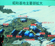 | 「しらせ」の時代になって本格観測が展開されることになった。 | 昭和基地全景。 | 昭和基地主要部。 倉庫棟、居住棟、金属貯油タンク、発電棟、汚水処理棟、作業工作棟などがある。 |