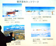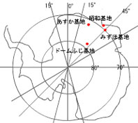 観測基地ネットワーク ・みずほ基地(標高2230m)、 あすか基地(標高930m) 年平均ー32.5℃、斜面降下風気候 ・ドームふじ基地(標高3810m) 年平均-54.3℃、高原寒極気候 ・昭和基地:年平均-10.5℃、沿岸気候 |