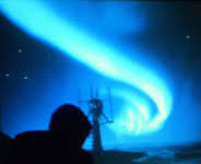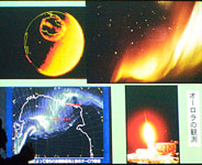 オーロラ。1976-79年の国際磁気圏観測計画(IMS)に対応したロケット観測、人工衛星で観測。太陽風エネルギーが地球磁気圏に侵入し、そのエネルギーが極夜の電離圏、熱圏で消費された時に生じる現象がオーロラ現象である。 | 日本の基地の位置はオーロラの観測をするのにとても都合が良い。 左記の発生機構の解明に世界で最初のロケット観測が行なわれた。 |