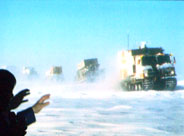 | 現在の雪上車による運搬風景。かなり大型化してきた。 | 赤い点が昭和基地の位置。 | 南極の氷は何万年もかけて下のほうで海に向かって流れているようである。したがって、ずっと昔の事を知ろうとすると、動かない氷を掘削せねばならない。 そのためにドームふじ基地を作ったのだ。 |
