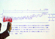 掘削した氷を調べている。 | この表の縦の軸が34万年分である。 | 赤くなっているところが地球の季節の移り変わりがほぼ一定してきたことを表す。それが70万年前ぐらいからである。 |