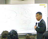 この日の講義が始まる前、IT委員会のスクール部部長で急逝された奥山峰生氏の冥福を祈って黙祷が運営委員長のもと行なわれた。ちょうどこの日がお通夜であった。奥山氏はこの金蘭会セミナーでも第78回に「インターネットで音楽を楽しもう」という演題で講師を務めてくれた。またパワーポイントやスライドなどを使われるセミナー講師のためにプロジェクターの準備、後始末やこまめな調整をしてくれていた人である。金蘭会にとってもIT委員会にとっても、そして何よりスクール部にとって非常に大切な人を失ったという思いでいっぱいである。心からの御冥福をお祈りしたい。 第94回のリポートも参考にしていただきたい。 さてその94回の時に参加者に衝撃を与えた「牛乳は飲む必要がない」という話題から。 牛乳のカルシウムは赤ん坊ならどんどん吸収することが出来るかもしれないが、大人の場合は過剰という反応になる。そもそも牛のカルシウムを摂ってそれが人間のカルシウムになるのか、というとはっきりとしたメカニズムがわかっていないのが実情。Caは原子番号が20、原子量は40、一方Mgは12の24、Oが8の16。だから体内ではMgとOでCaが作られているのかもしれない。最近ではCaだけとっても意味がない、Mgと一緒にとらなければ、と言われている。(ネットで調べると、代謝の具合でMgがCaに取って代わる事もある、とあった。) さらには栄養バランスを考える必要もない、と松田氏は言う。 もっというなら人間は草食動物でいい!という。 理由は必要な元素はN(窒素)、H(水素)、C(炭素)、O(酸素)なのだから、野菜でH、C、Oが補給でき、たんぱく質にしか含まれていないと思えるNは地球には無限にある。肺からNは吸収されるのだ。動物実験でも、食べたNの量より、出て行くNの量の方が多いという。明らかに空気中から摂り入れられているとしか思えない。 そう考えると、草しか食べない草食動物の牛がなぜあのように立派な肉を作ることが出来るのか理解できるのではないだろうか。 食べたものを完璧に分解してアミノ酸にして、再合成するのだから。 前述のようにアミノ酸はNとHとCとOがあれば出来る。 もう一つBSE(牛海綿状脳症)についての、松田氏の意見。 これはガタがきた蛋白ができてしまう病気であるが、牛に牛もしくは羊などの他の哺乳動物の肉を食べさせた事によって起こってきた。本来草を完璧に消化してアミノ酸にして蛋白を再合成してきたものが、自分と同じような哺乳動物の肉を食べると、完璧に分解する事を怠けだす。もしくは草食動物には哺乳動物の蛋白を分解する能力がないとも言える。そのように不完全な既製品(分解せずそのまま)を使うことによってたんぱく質にガタが来たのではないか。 人間も例外ではなく、人間の肉と似ている牛の肉を食べだして、いま起こっている異常としてはパーキンソン病が考えられる(潜伏期25〜35年)。人肉を食べる習慣のあった部族ではクール病が起こってきたらしい(潜伏期は15年)。 肉を食べると成長が早い=身体に良い。という錯覚でどんどん肉を食べたために、異常を排除しようとする免疫機構がへとへとになり、(つまり敵味方の区別が付かなくなり)起こってきているのが、膠原病、アレルギー、ガンである。 その証拠にがん患者は肉好きが多いらしい。完璧に草食動物にもどす事によって、治療効果が上がっているらしい。 魚や大豆蛋白は人間の蛋白とは随分違い、分解しやすいらしい。 蛋白質を摂るならそれらにすると安心ということだろう。 さらに「塩分控えめはとんでもない」という意見。 祖先は海の中から発生した。したがって血液は海の水の成分と同じ。 ところが問題は日本政府がNaCl(塩化ナトリウム)に精製したもの以外を「不純物いっぱいの悪いものだ」と禁じたことに問題がある。 大切なFe、Se、Zn、Mo、K、Mg、Caなどを摂る事が出来なかった。 ところが最近外国からの岩塩の輸入を禁じることが出来ず、不純物が入っていてもいい、ということになった。 ただ、気を付けないといけないのは最近の「天然塩」と銘打って売られているものには塩化ナトリウムにホンの少しマグネシウムを混ぜただけのような物もあり、「まったくのニセモノです」ということだ。 水は還元電位の高い水が良いという。これはアルカリイオンの事ではない。 クラスター(集団になったもの)の大きい水はダメ。外を回っている電子がほかに取られるといくつかまとめてその周りを回ろうとする(=クラスターが大きくなる)。都会の水はダメらしい。(うーむ・・森林で水を汲めばいいのだろうか・・) 「食事の話はこれぐらいでいいですか?」ということで、後半は霊魂のはなし。 ほとんどが前回94回の時の話と同じであったが、今回はじめて聞いた話。 肉体から離れた霊魂はどこへ行くのか。ユングという精神科医は宇宙意識と呼んだが松田氏は「意識がないのだから『宇宙無意識』です」という。我々の住んでいる世界が3次元、時間の概念が4次元とする