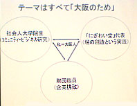 今回の講師寺西章江氏は平成13年5月に第48回セミナーのときに「アジアの元気な中小企業ービジネスパートナー都市って何?−」というタイトルでお話くださっている。 当時はまだWEB金蘭会が立ち上がっていなくて、リポートが出来ていないのが残念だが、今も本職は企業誘致プランナーである。寺西氏曰く年間平均40社ぐらいが大阪に支社を置きたいのだがと問い合わせてくる企業があるという。 さて、本日の話題「にぎわい堂」というのは、どちらかというと寺西氏のボランティア活動になるだろう。資料に沿って書くことにする。 1.大阪人として ・自分の出来る事をする。 ・仕事&社会人大学院&にぎわい堂(2番目の図) ・うつぼの会、上方研究の会など→にぎわい堂設立(2003年11月)のきっかけ 2.商店街は、知恵の宝庫 ・コミュニケーションのプロに癒される ・知恵と目利き ・商店街で遊ぼう! ・日常が面白い 寺西氏はインタビューで「大阪は幸せもんである。これだけ多くの人々が欲得抜きで『大阪のために何かしよう』と活動していたり、『大阪を盛り上げたい』とか口走っていたりするのだから。特に2年半前「にぎわい堂」を立ち上げてから、このテの大阪人に出会う機会が増えた。類は友を呼ぶ、ということだろうか」と語っている。 3.「にぎわい堂」の活動 これは下の画像を見ていただきたい。 また、ぜひにぎわい堂のホームページを見ていただきたい。 ・空堀の商店街の応援勝手連として。 空堀商店街というのは3つの商店街が連なったものらしい。(5番目の図) 谷町筋から東の商店街と、谷町筋と松屋町筋の間で二つの商店街に分かれているという。(大体のところで色分けしている) 6番目の画像にあるアーケードを見ればどこが境目かがわかるらしい。 4.コミュニティ・ビジネスとは (これは寺西氏の現在参加している大学院での研究テーマでもあるらしい) ・地域や社会の問題を解決する非金銭的利益が目的である事業。 ・行政任せではなく、コミュニティの構成員自らが問題解決を図る。 ・地域コミュニティの資源(歴史、人、文化など)を活用。 ・ビジネスの手法で、継続性を持たせる ・事業で得た利益は分配するのではなく、事業に還元する。 しかし、なんとわかりにくい概念なんだろう。 「ボランティアの意志をもって経済を回していく」・・・?? 7番目の画像に「コミュニティ・ビジネスの事業分野」と、たくさんあって驚く。 具体例を知るには「大阪 コミュニティ・ビジネス」といれて検索すると、大阪府のCBネットというサイトが見つかり、そこにいろいろ載っている。ぜひご覧いただきたい。 5.日本のコミュニティ・ビジネスの特徴・問題点 ・定義概念があいまい→認知度が低い(行政の世界ではよく使われるらしいが) ・組織形態は多様(特定非営利活動法人、有限会社、株式会社、任意団体など) ・「ビジネス」という用語に対する誤解。 ・コミュニティ・ビジネスの自立とは?社会性と事業性 6.これからのコミュニティ・ビジネス ・社会での認知度を上げる→コミュニティ・ビジネスと行政・企業との関係が課題。 ・アホが必要 ・どんどん儲けて成功事例を生み出そう!←何をもって成功とするか ・ぼちぼち、やりまひょ。 講演後の話。 5番目の図に「練」や「惣」というスポットがあるが、そこも古い長屋のような建物を買い上げておしゃれな店舗に貸し出しているところだそうだ。雑誌にも紹介されて、休日などは雑誌片手に訪れる観光客も多いという。訪れる人が増えるのは嬉しいことなのだが、そういう人たちが必ずしも商店街で買い物をしてくれる訳ではない。 商店街のにぎわいというのは、やはりつっかけエプロン姿で買い物に来てくれる人たちが増える事でもあってほしい。町並みを保存しながら。 こういうジレンマをいかに解決していくか、そういう話し合いが「にぎわい堂」でも持たれていることであろう。 寺西氏に「大学院での研究のために自らコミュニティ・ビジネスをされているのですか?」と質問すると、今のところは運転資金(家賃、光熱費など)も持ち出している状態らしい。立ち上げの時も大阪府からは百万円の援助金は出たらしいが、それと同額、それ以上のものは出費しているという。「ですから、コミュニティ・ビジネスとはいえないのです。少なくとも人件費が出るぐらいでないと」とのこと。 6項目目にある「アホが必要」を身を持って実践しておられるというところか。 「何をもって成功とするか」はこれからのテーマだろう。 少なくとも「どんどん儲けて」とはならないに違いない。 しかし、そういう大阪人にとても好感をもってしまう。 かくいう私も同類だからだろう。 |