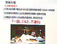 | 発酵日数の平均を18日とするならばその一日前で発酵を止めたものを甘口、一日後で止めたものを辛口という。 | 灘の清酒に使われる米は山田錦。最も高い米らしい。それを蒸米にするまでに種類により25%〜60%精米してしまうのだから清酒の値段が高いのも無理はない。取り除いたものは、それぞれ、糠や上新粉として、使われる。 | 麹菌がでんぷんを分解して糖にするからこそ酵母菌が繁殖できる訳だから、「一麹」と第一番目に挙げられている理由も分かろうというものである。 |