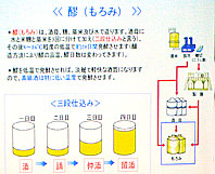 | いかに江戸へ早くもって行くかが業者の間で争われた。海路が有利であった。江戸へ行く事は「下る」といった。そこから「くだらない」という言葉が出来た。 | 発酵と腐敗は人の役に立つかどうかで呼び方が変る。 | 上にも書いたが、清酒は麹で蒸米を糖化しながら酵母で発酵する、それを同時に同じ釜で行なうというのが特徴。この大量の酵母で発酵させるという事が防腐剤を必要としないゆえんなのである。 |