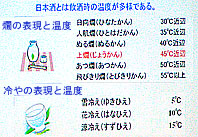 | これだけ日本酒の温度の呼び方があるとは驚きである。燗でも冷やでもおいしい、数少ない酒である。 | ・甘い味付けには甘口タイプ ・濃い味付けには濃醇タイプ ・塩辛みには辛口タイプ ・旨みの強いものには濃醇タイプ ・酸味には甘口タイプ ・香り控えめには吟醸タイプ ・脂っこいものには 淡麗タイプ(ウオッシュ) 熟成タイプ(ハーモニー) 最後の例にあるように、結局は好みで選べばいいのである。 |